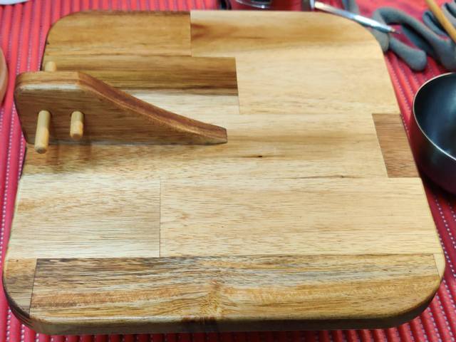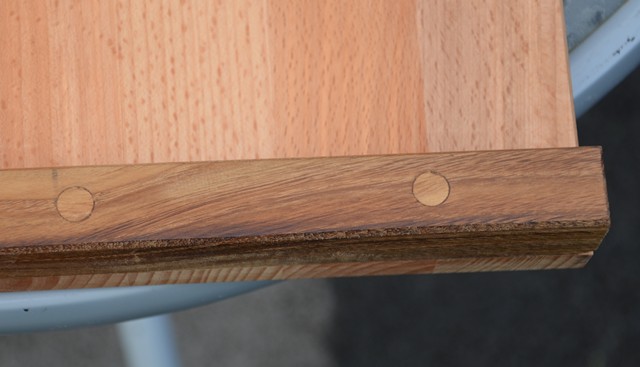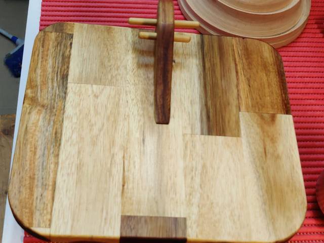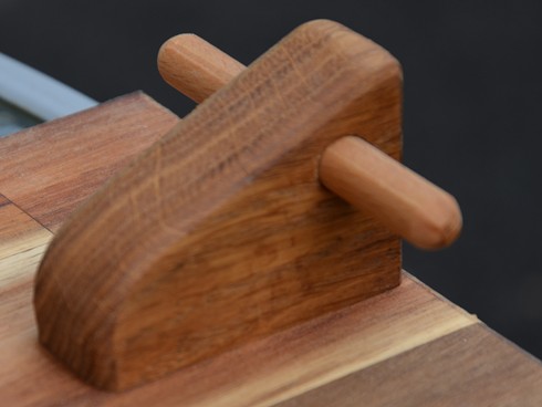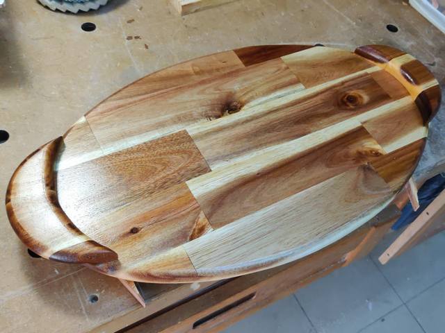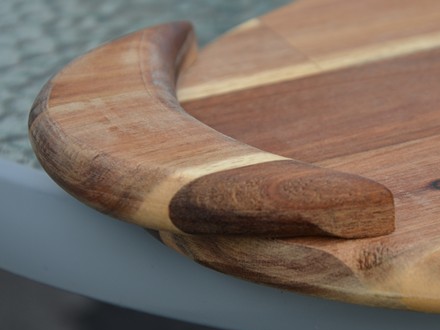 Planches en acacia abouté de 18mm d’épaisseur, mais peuvent être faites en d’autres essences.